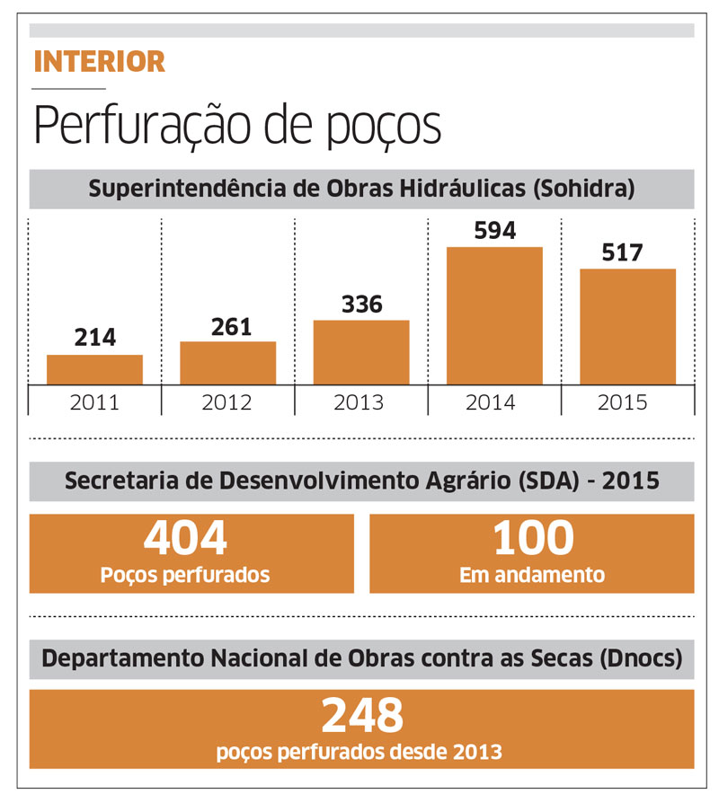 A Secretaria de Desenvolvimento Agrário (SDA), por meio do Programa Água para Todos, somente neste ano, perfurou 404 e outros 100 estão em andamento. O Departamento Nacional de Obras contra a Seca (DNOCS) através do programa federal da Defesa Civil perfurou 248 unidades desde 2013. Soma-se a esse número outros poços que foram feitos no programa Água para Todos, cuja fonte de água pode ser poço ou açude.